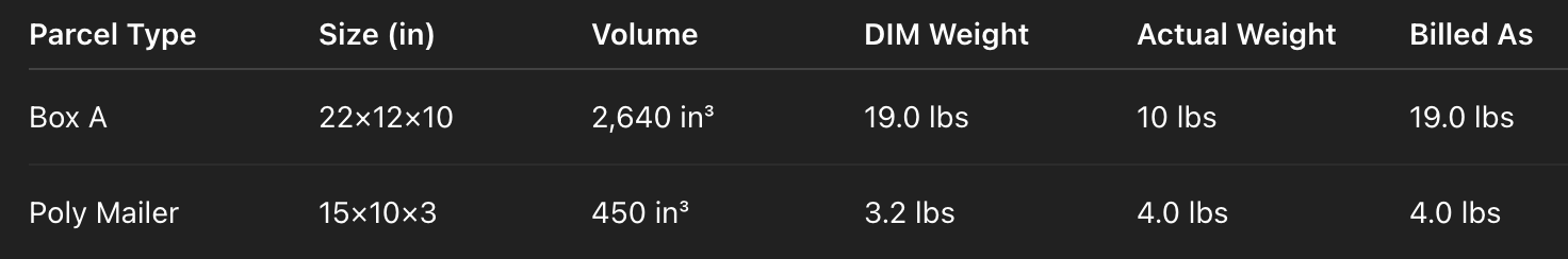 DIM weight = (12×10×6)/139 = 5.2 lbs — meaning they paid for nearly double the actual weight.
